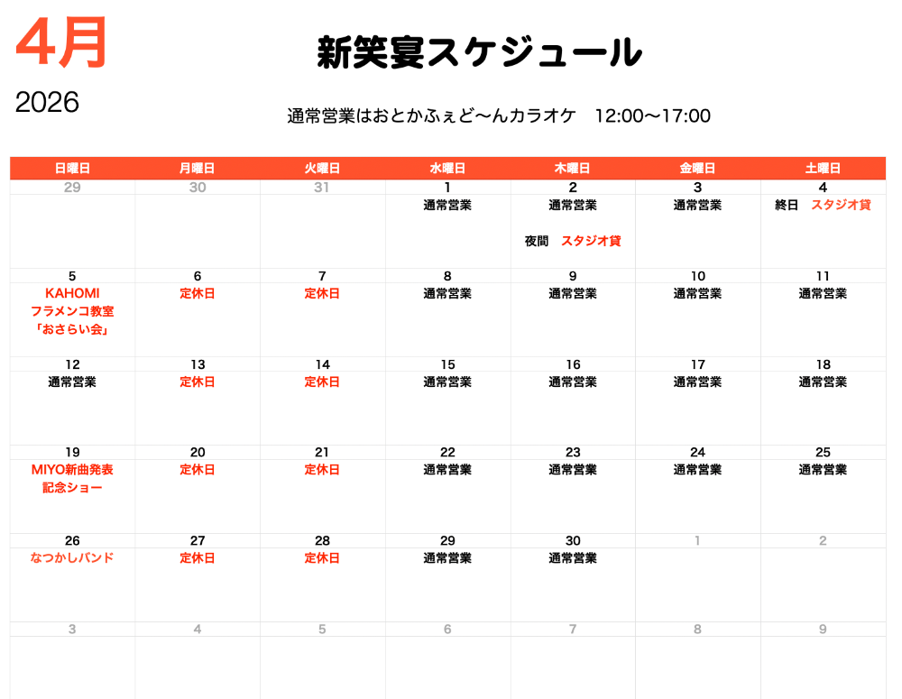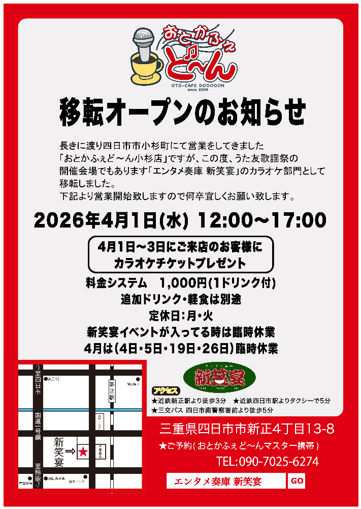2026年4月1日より、姉妹店のカラオケ喫茶「おとかふぇど〜ん」が新笑宴にてカラオケ部として通常営業を開始しました。